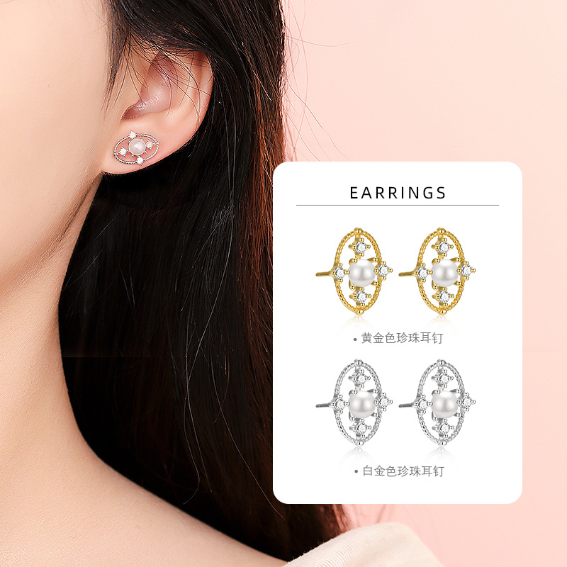 S925 sterling silver oval pearl earrings female simple hollow palace style high-grade sense of niche ear piercing ear bone stud