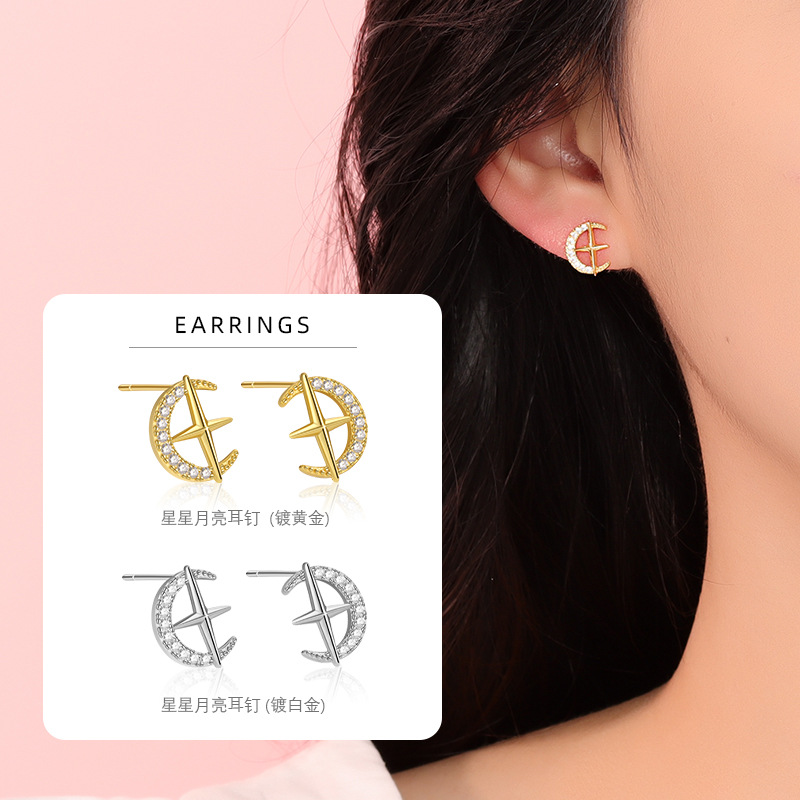 S925 Sterling silver micro-inset Zircon star Moon earrings Small exquisite plated 18K Venus Moon piercing earrings for women